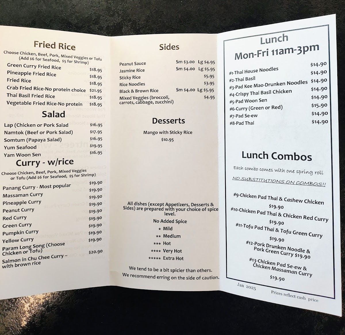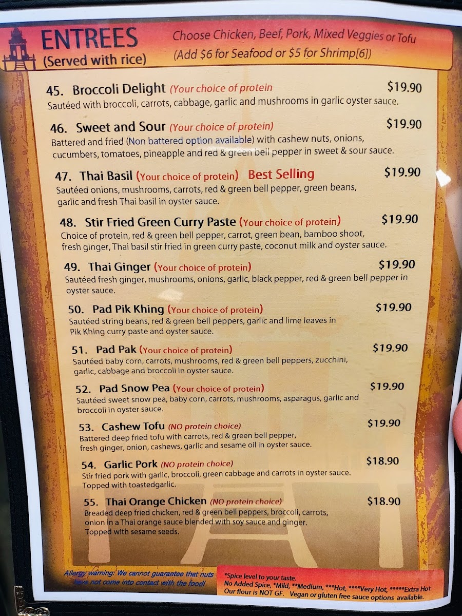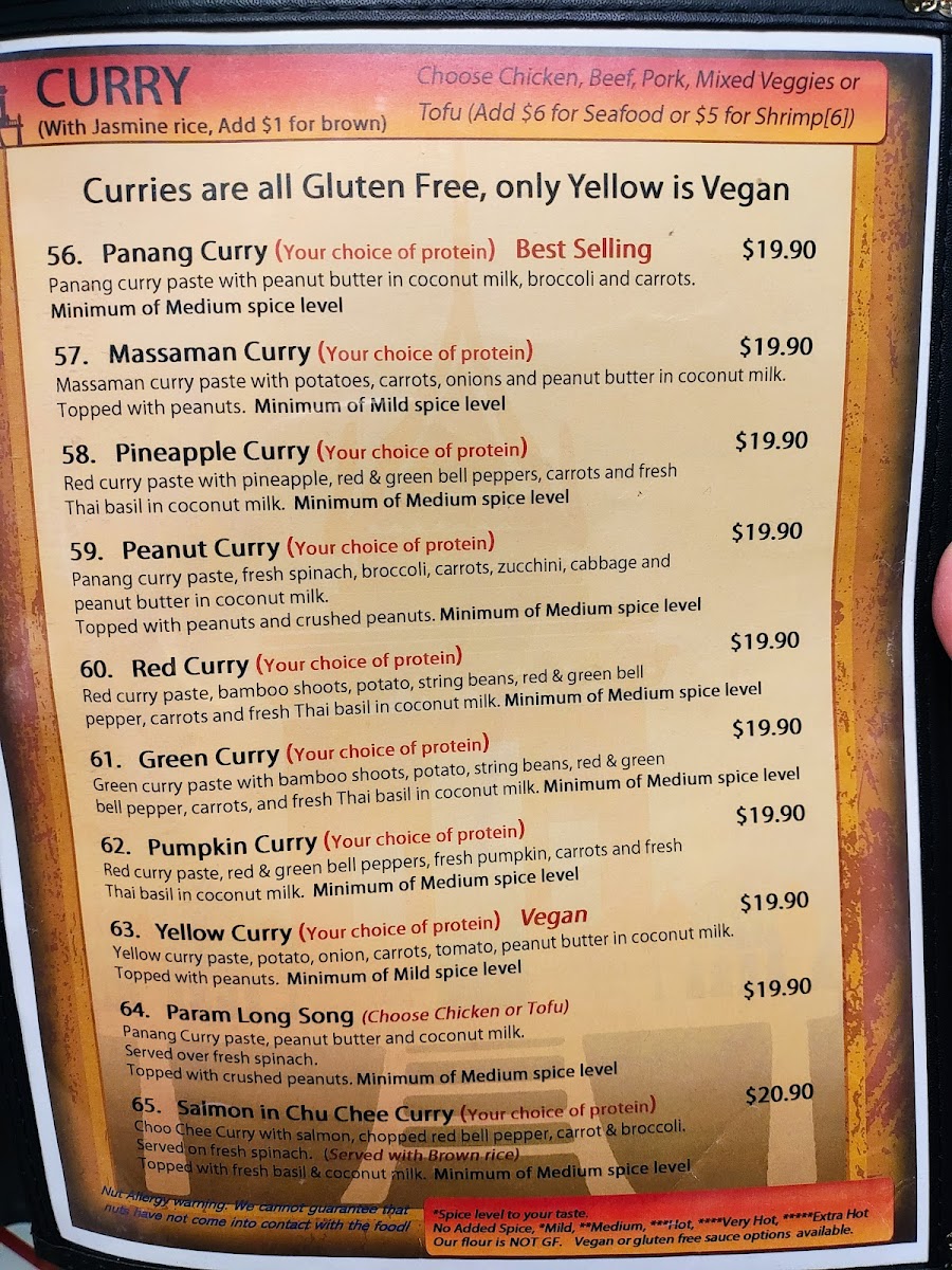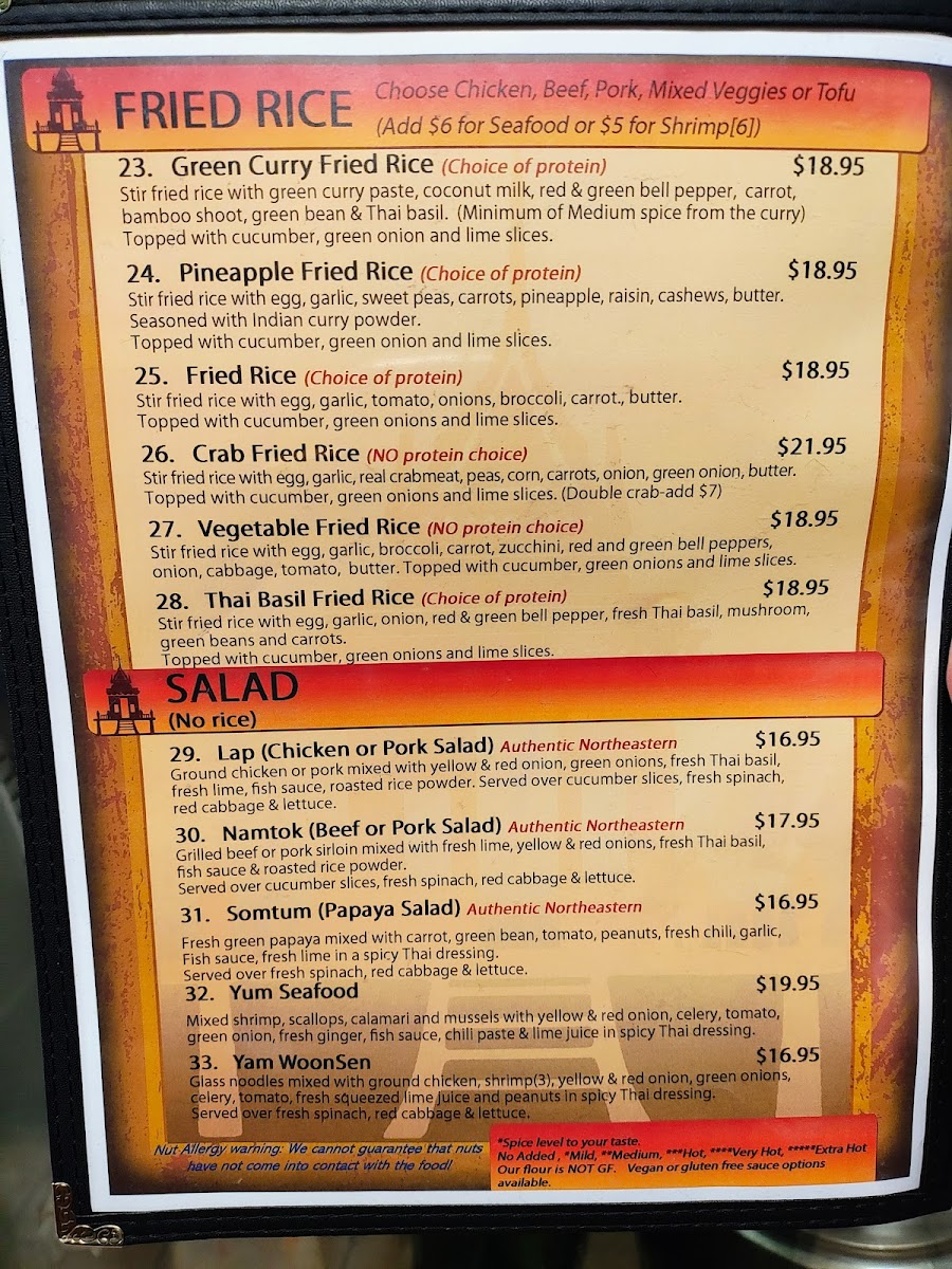 You’ll find classics like Thai Basil Fried Rice and Tofu Pad Thai, alongside richly flavored curries such as Pineapple Curry with Veggies and Peanut Curry with Chicken. Light bites like Crab Rangoon and Shrimp Rolls complement larger plates, making it easy to mix and match depending on your appetite or occasion. The beverage menu, featuring smooth Thai Iced Tea, offers a cooling balance to the spices and herbs of the food.